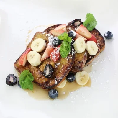 Butter pancakes served with fresh strawberries, bananas, and whipped cream topped with light powdered sugar. Syrup provided on the side.